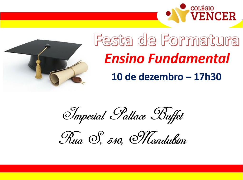 O Colégio Vencer tem o prazer de informar a nossa comunidade escolar sobre a Festa de Formatura do Ensino Fundamental, um momento especial de celebração e reconhecimento pelas conquistas dos nossos formandos.